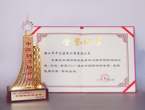 2016年5月,麗水市中立建筑工程有限公司總承包的麗水市體育中心體育館建設工程榮獲由中國建筑金屬結構協會建筑鋼結構分會頒發的“中國鋼結構金獎”。成為麗水市首個獲得此項殊榮的工程。